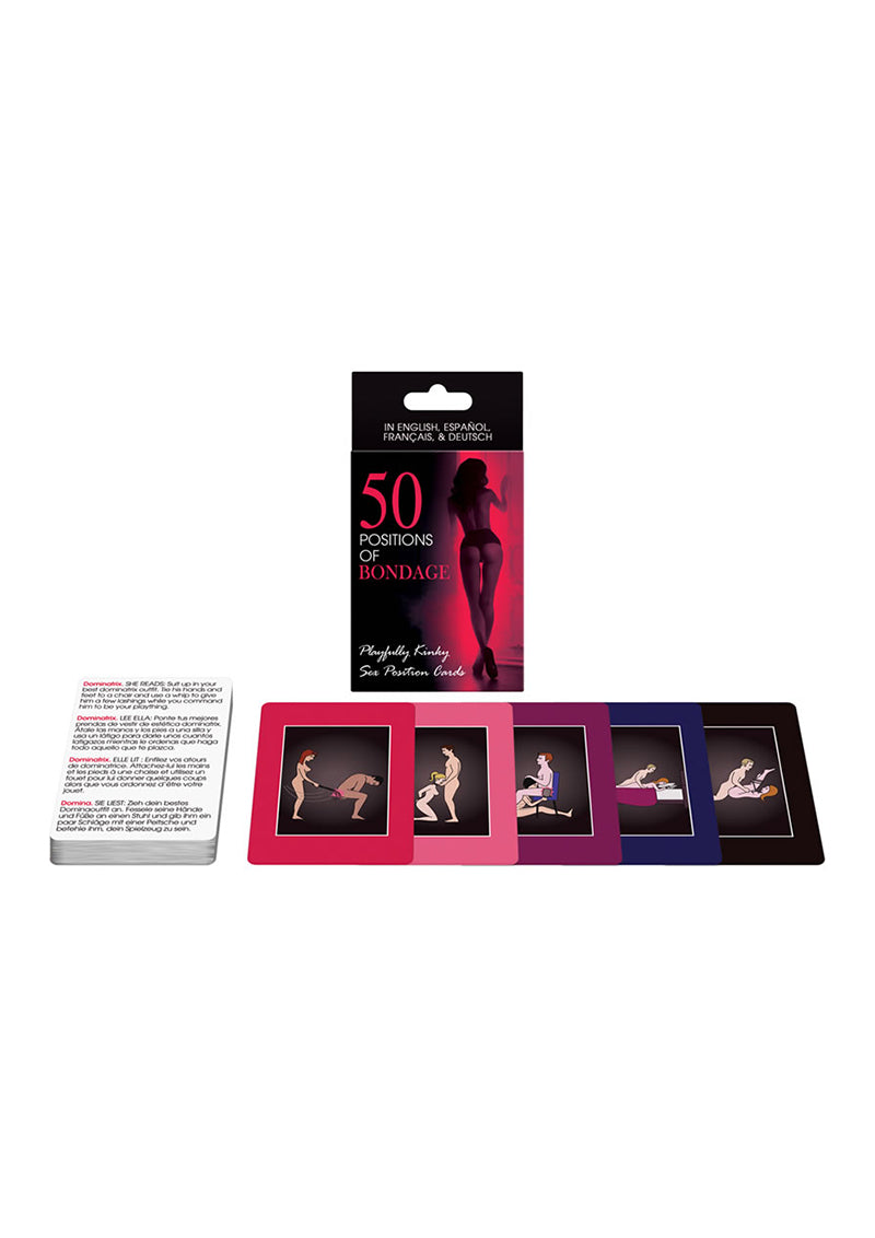 Playfully kinky sex position cards! Compete against your lover to build a five-card fantasy that includes five categories of bondage position challenges. The cards can also be used as flash cards for ideas of sex positions you can experiment with that incorporate bondage.