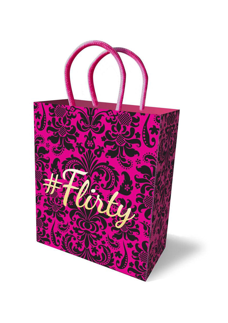 This hot pink 8 x 5.5 in. gift bag with velvet-like flocked pattern featuring an imprinted gold foil stamp of #Flirty is high quality and perfect for gifting sexy and fun items.