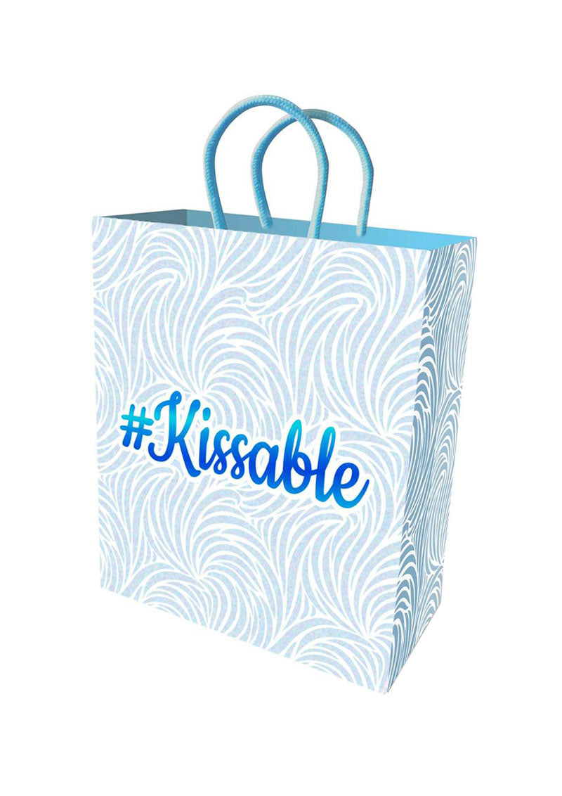 This high quality 10-inch gift bag has a white background with baby blue flocking and matching metallic stamped #Kissable on front and back. Perfect for gifting cute and flirty items to someone special in your life.