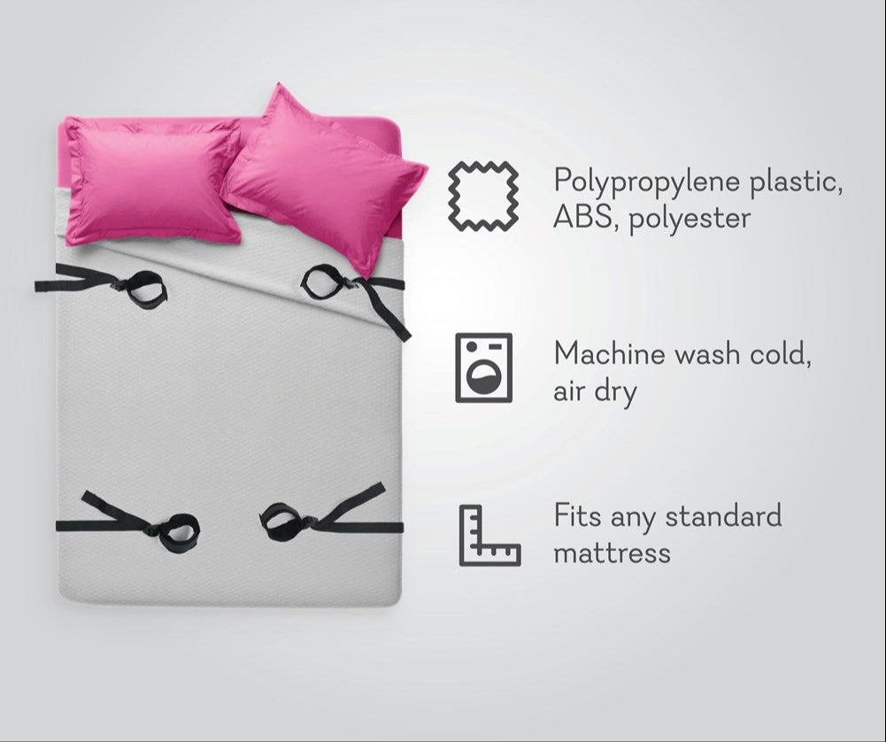 - 4 adjustable cuffs (fits 4-12" wrists), four restraint straps secured to one connector strap that fits securely under your mattress
